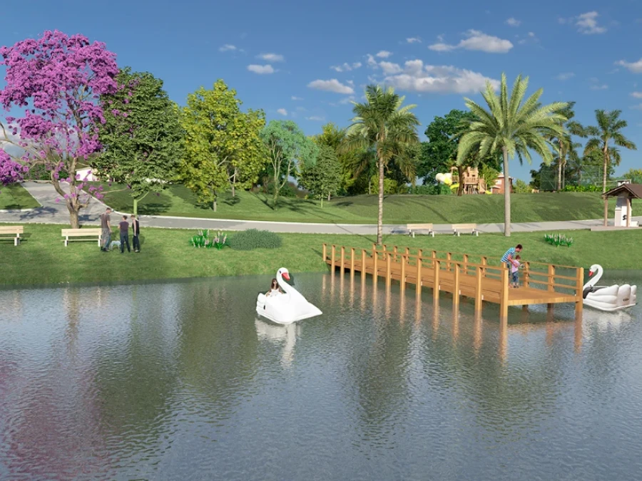O condomínio Encosta do Lago conta com infraestrutura completa incluindo academia, piscina e playground para toda família. O empreendimento oferece segurança 24 horas em ambiente residencial exclusivo, proporcionando qualidade de vida em área verde preservada. O terreno aceita financiamento bancário facilitando a aquisição.